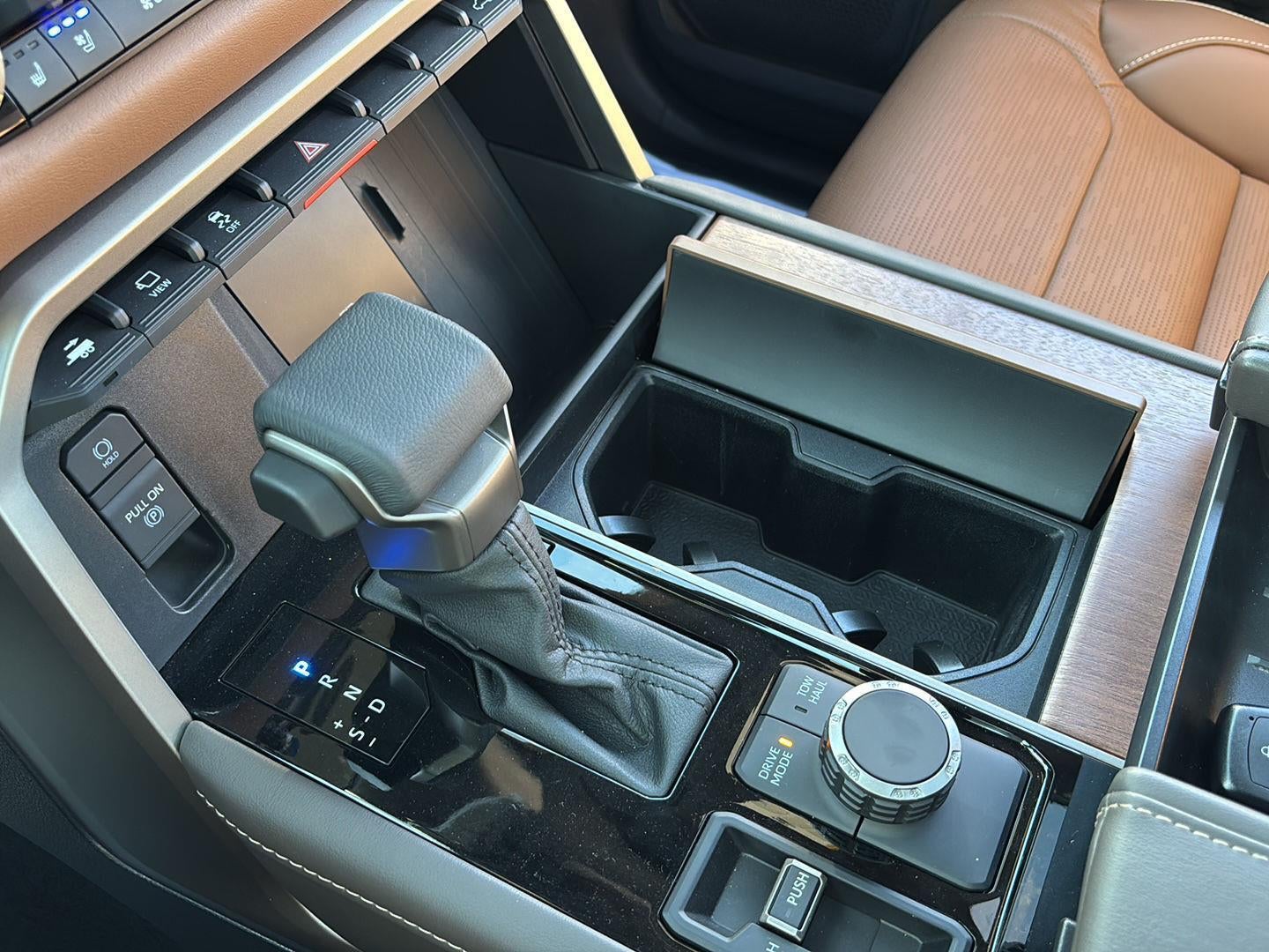 - Fixed center console with gated shift lever, driving controls, four cup holders, and center storage bin